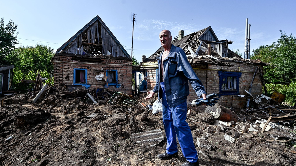 Ein Hausbesitzer begutachtet seinen Hof im Dorf Kuschuhum, in den eine mutmaßlich russische Granate eingeschlagen ist. - Foto: ---/Ukrinform/dpa