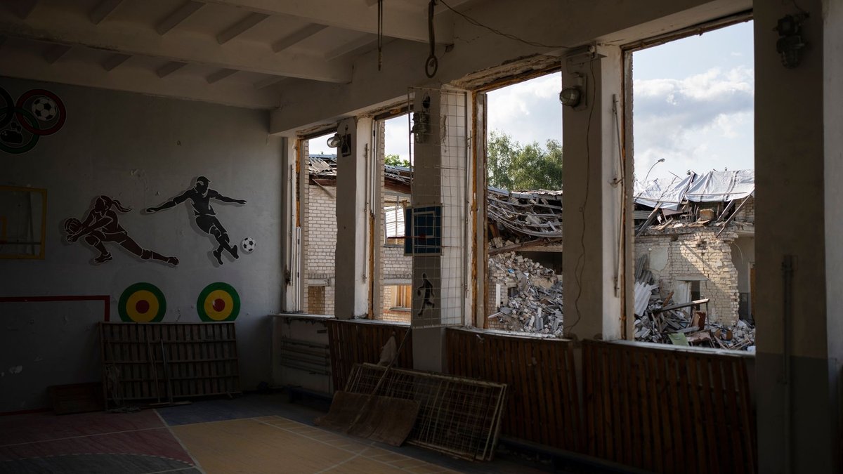 In Kupjansk ist durch die zerbrochenen Fenster einer Turnhalle die zerstörte Bibliothek einer Schule zu sehen. - Foto: Bram Janssen/AP