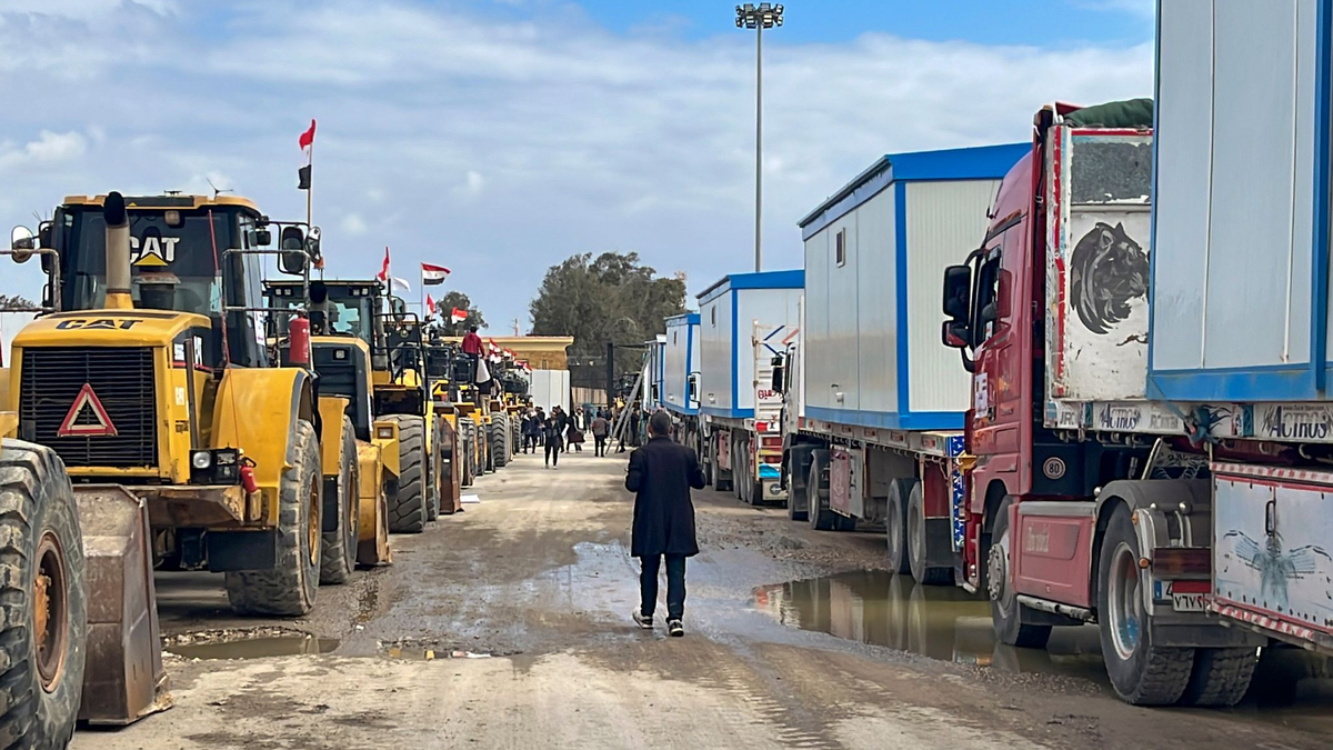 • Bulldozer und Lastwagen mit Wohncontainern warten am Rafah-Grenzübergang. (Archivbild) - Foto: Mohamed Arafat/AP/dpa