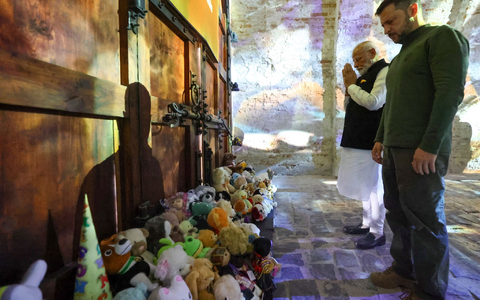 Nur Wochen nach seiner kontroversen Umarmung mit dem russischen PrĂ€sidenten Wladimir Putin hat Regierungschef Narendra Modi den ukrainischen PrĂ€sidenten Wolodymyr Selenskyj getroffen. Auch ihn schloss der 73-JĂ€hrige wĂ€hrend des ersten Besuchs eines indischen Regierungschefs in der unabhĂ€ngigen Ukraine in die Arme. Modi besuchte mit Selenskyj eine GedenkstĂ€tte fĂŒr die im Krieg getöteten ukrainischen Kinder, wo er eine Puppe niederlegte.