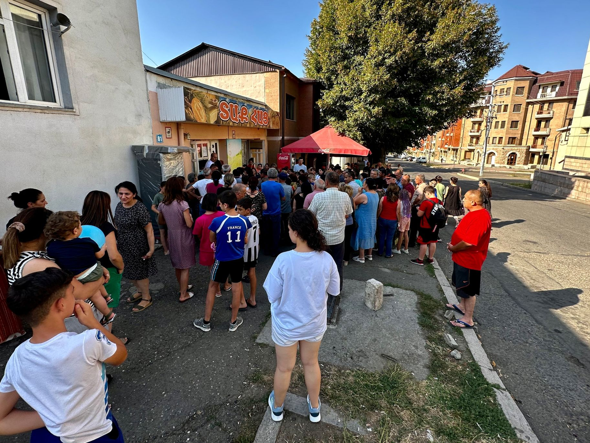 Vor allem aber sind die Apotheken leer. Auf den Märkten gibt es kaum es etwas zu kaufen. Es fehlt an Benzin, um Obst und Gemüse aus dem Umland nach Stepanakert (aserbaidschanisch: Khankendi) zu bringen. Für Brot müssen die Menschen Schlange stehen.