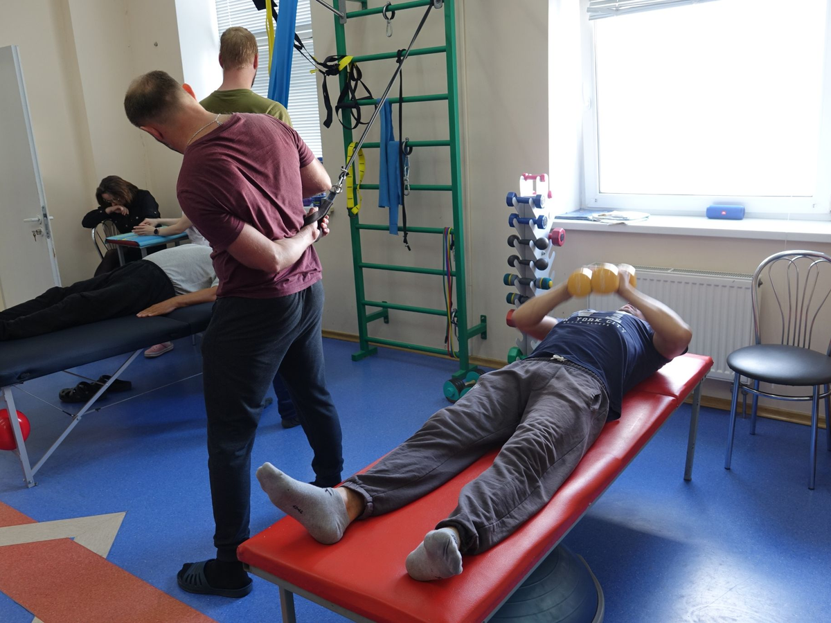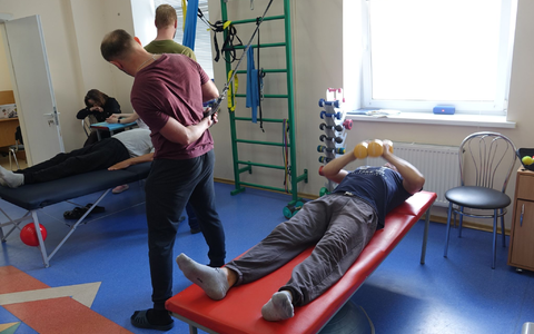 Im Gymnastikraum mühen sich mehrere Männer mit Widerstandsbändern, Expandern und Hanteln. Nach den Operationen verfolge die Reha einen umfassenden Ansatz, sagt Borsych: Physiotherapie, Ergotherapie, Orthesen und Psychotherapie. Es sei wichtig, bei den Patienten nicht nur die Funktion der Gliedmaßen wiederherzustellen, sondern sie in den Alltag zurückzuführen, «Lebensqualität und Vitalität zu erhalten». Die Soldaten spielen in der Therapie mit Hunden; sie freuen sich an einem Chinchilla, das auf der Station gehalten wird.