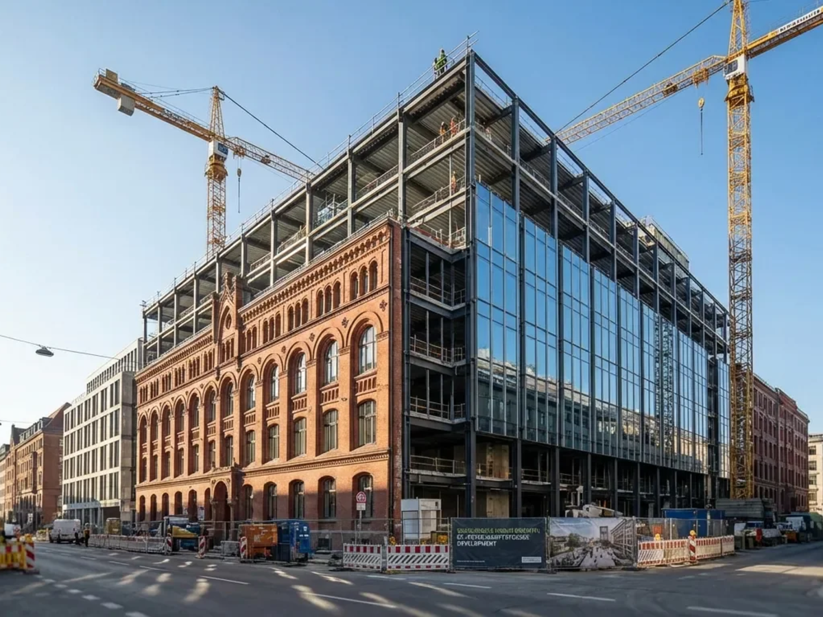 Anders als bei vielen früheren Projekten setzt die Entwicklung an der St.-Peter-Hauptstraße 42 und 48 nicht auf kompletten Abriss. Stattdessen kombiniert sie den Neubau eines Büro-Wohn-Gebäudes mit dem Umbau eines Bestandsgebäudes zu Büroflächen.