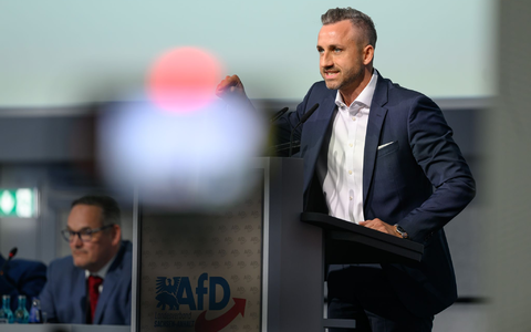 AfD-Landesvize Hans-Thomas Tillschneider sagt bei der Vorstellung des Programms, Kinder bräuchten kein Antirassismustraining, sondern Selbstverteidigungskurse. Er skandiert mit den Delegierten «Ost-, Ost-, Ostdeutschland.»