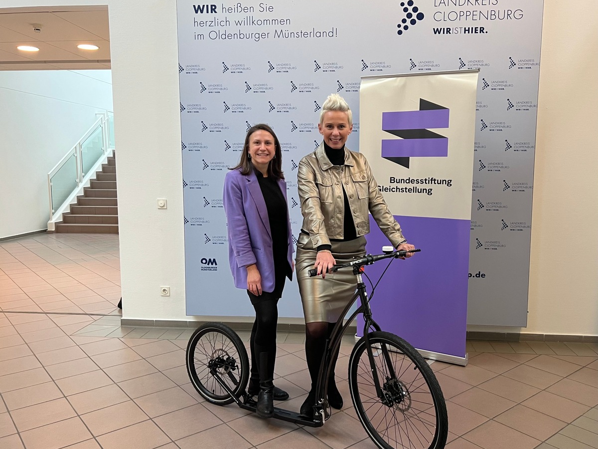 Pflegende Angehörige sind groĂen psychischen, körperlichen und finanziellen Belastungen ausgesetzt: HĂ€ufig mĂŒssen sie die eigene ErwerbstĂ€tigkeit mit der Organisation von Pflege und Familienalltag vereinbaren - eine enorme Herausforderung. Der zweite Termin der Veranstaltungsreihe "Bundesstiftung Gleichstellung on Tour" widmete sich am 22. November 2023 zentralen Fragen rund um Vereinbarkeit und Gleichstellung. Bei einem WerkstattgesprĂ€chs im Kreishaus Cloppenburg tauschten sich Silvia Breher (MdB, CDU und Mitglied im Stiftungsrat), MarĂ©n Feldhaus (Gleichstellungsbeauftragte Landkreis Cloppenburg) und Astrid Brokamp (Gleichstellungsbeauftragte Landkreis Vechta) sowie Lisi Maier, Direktorin der Bundesstiftung Gleichstellung, mit Expert*innen aus Pflege und Wirtschaft aus.