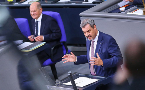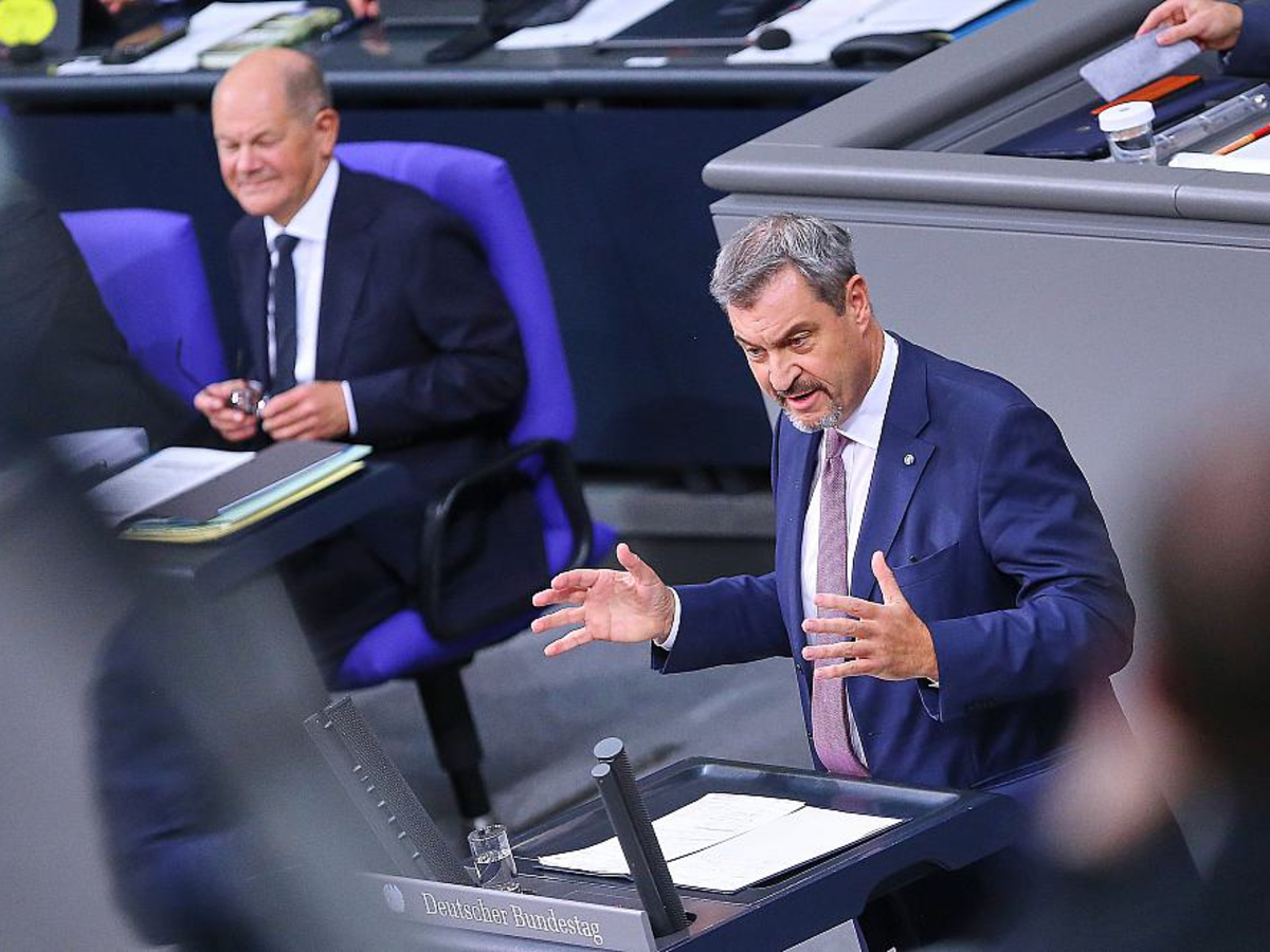 "Je stĂ€rker wir werden, desto klarer können wir zum Beispiel auch der SPD den Stempel aufdrĂŒcken in einer gemeinsamen Regierung", sagte er in den ARD-Tagesthemen. Allerdings wĂŒrde eine Koalition laut Söder nur gelingen, wenn Olaf Scholz nicht dabei wĂ€re, dieser habe sich am Montag "blamiert".