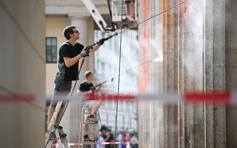 • Reinigungsarbeiten nach einem Farbanschlag der so genannten Letzten Generation auf das Brandenburger Tor. - Foto: Britta Pedersen/dpa