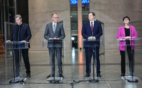SPD-Chef Lars Klingbeil betonte, dass Deutschland den großen Investitionsstau nun angehen werde. «Eine künftige Regierung muss den Verschleiß unseres Landes stoppen», sagte er. Die SPD wolle in den weiteren Gesprächen darauf drängen, dass Familien entlastet werden, dass die Renten stabil sind und es ein gerechtes Steuersystem gebe. Ganz vorne aber stehe ein gemeinsames Verständnis für die Größe und die Bedeutung der Aufgabe, sagte der SPD-Chef mit Blick auf die Einigung in Finanzfragen.