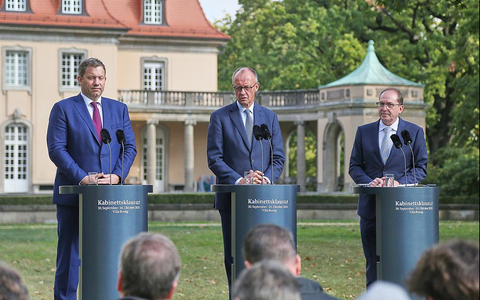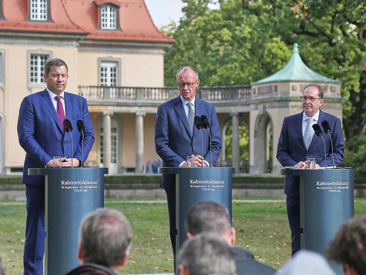 Klingbeil, Merz, Dobrindt bei Kabinettsklausur in der Villa Borsig am 01.10.2025 - Foto: über dts Nachrichtenagentur