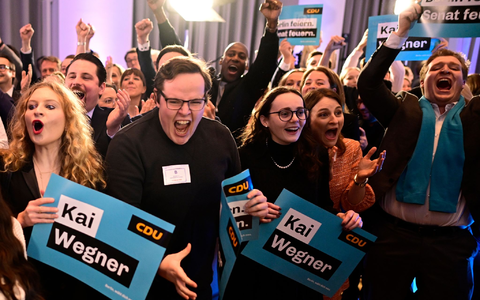 • Freude bei Teilnehmern der CDU-Wahlparty im Konrad-Adenauer-Haus in Berlin. - Foto: Fabian Sommer/dpa