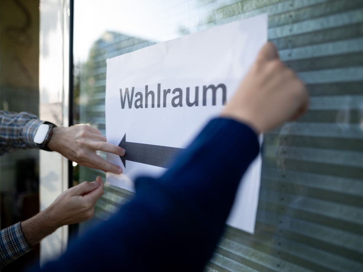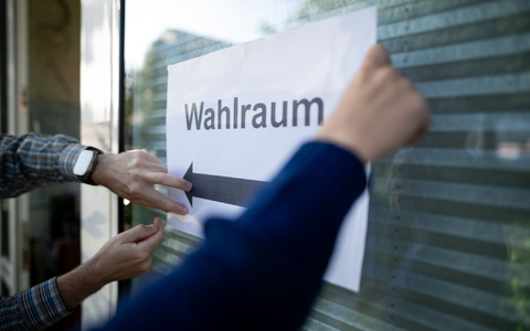 • Wahlhelfer hängen einen Zettel, auf dem „Wahlraum“ steht, auf. - Foto: Fabian Strauch/dpa