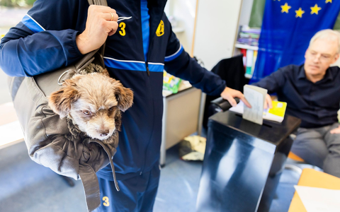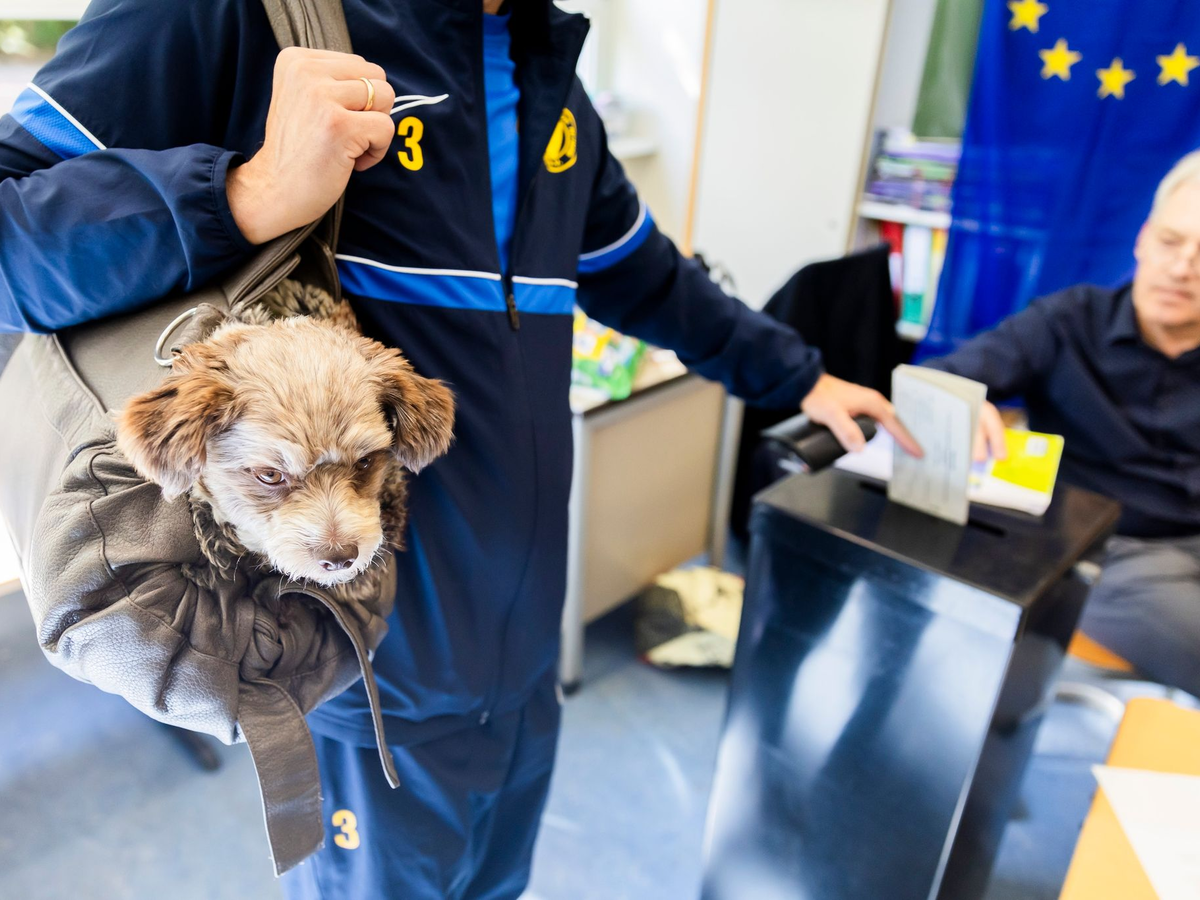 • Hund Jogi ist im Wahllokal in der Grundschule am Ritterfeld im Ortsteil Kladow im Berliner Bezirk Spandau bei der Stimmabgabe zur Europawahl 2024 dbaei. - Foto: Christoph Soeder/dpa