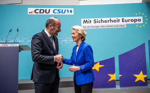 • EU-Kommissionspräsidentin Ursula von der Leyen zusammen mit dem Vorsitzenden der EVP-Fraktion Manfred Weber im Europaparlament. - Foto: Michael Kappeler/dpa