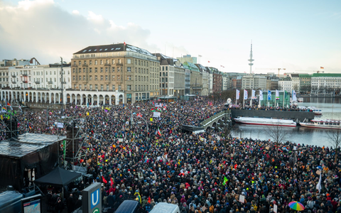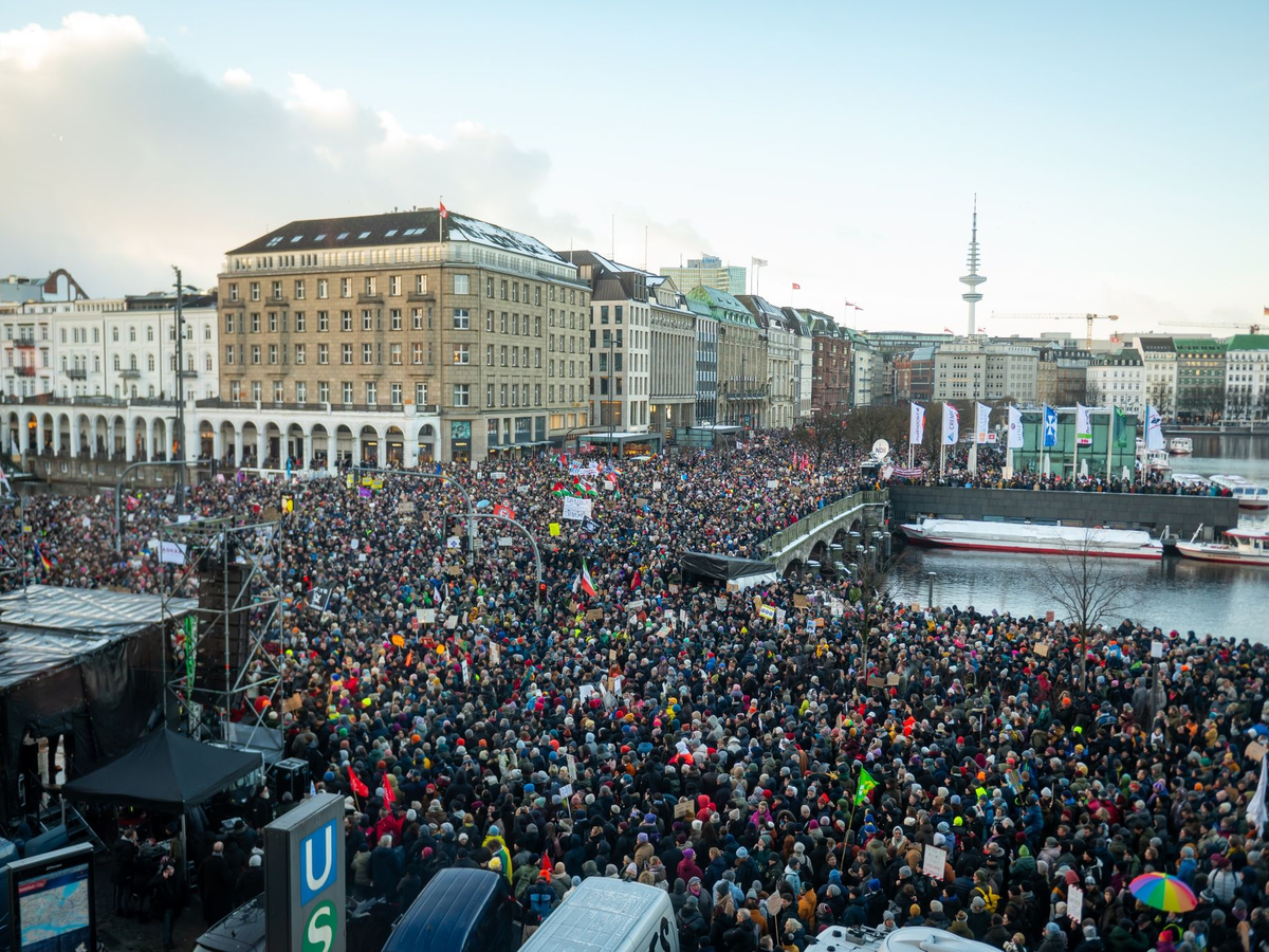 Die Demonstration stand unter dem Motto «Hamburg steht auf - Gemeinsam gegen Rechtsextremismus und neonazistische Netzwerke». Auch in Jena, Kiel und anderen deutschen Städten demonstrierten Tausende. Bundeskanzler Olaf Scholz stellte sich hinter die Demonstranten, die an diesem Wochenende zu Zehntausenden im ganzen Bundesgebiet auf die Straße gehen wollten. Er verglich die «Remigrations»-Pläne Rechtsradikaler in Deutschland mit der Rassenideologie der Nationalsozialisten.