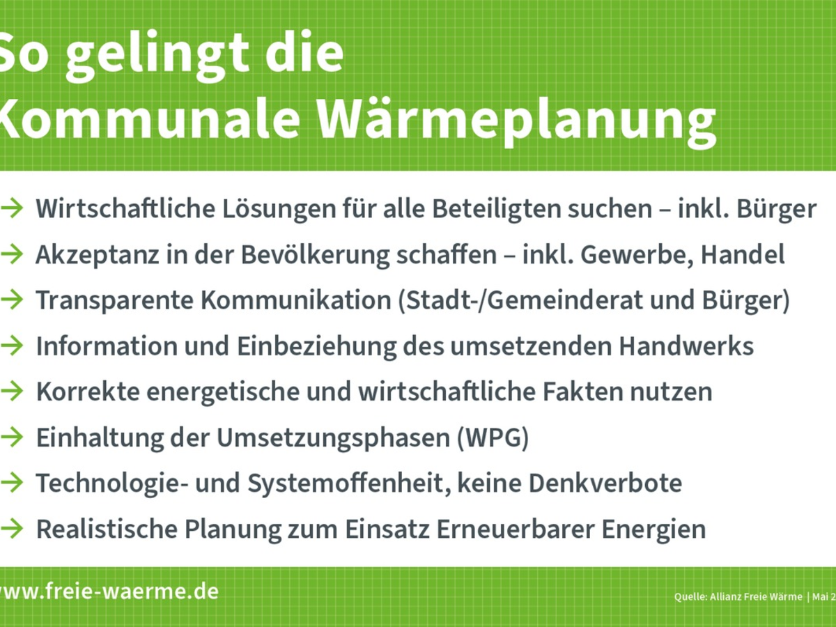 Nach Einschätzung der Allianz Freie Wärme steht die Umsetzung der Wärmeplanung zudem vor massiven Herausforderungen: fehlende Fachkapazitäten, lange Genehmigungszeiten sowie hohe Investitionsbedarfe für Netze, Speicher und Gebäudemodernisierung. Damit die Wärmewende gelinge, brauche es realistische Zeitpläne, praktikable Standards und verlässliche Förderkulissen.