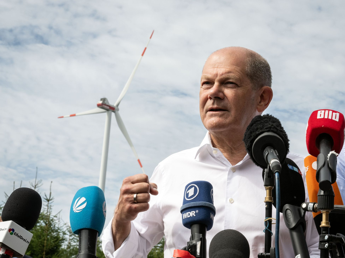 Der Kanzler war mit Nordrhein-Westfalens Ministerpräsident Hendrik Wüst (CDU) in dem Windpark in Simmerath. Die 22, bis zu 196 Meter hohen Windräder stehen auf gemeindeeigenem Waldgebiet und bringen der Eifel-Kommune jährlich einen Millionenbetrag.
