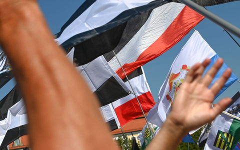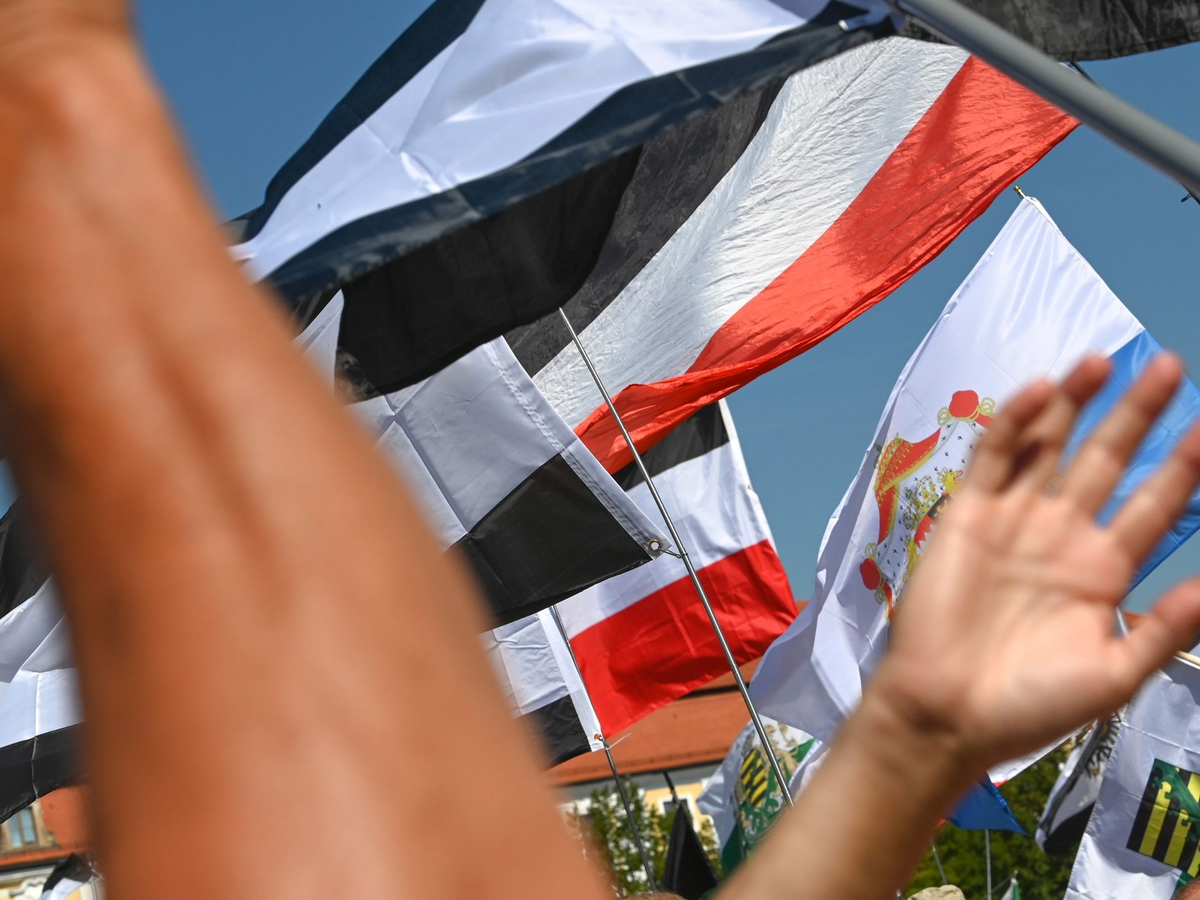 Reichsflaggen werden auf dem Magdeburger Domplatz zu einer «Reichsbürger»-Kundgebung hochgehalten. - Foto: Heiko Rebsch/dpa