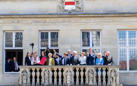 • Der französische Präsident Emmanuel Macron winkt der Menge vom Balkon des Stadtweinhauses zu. - Foto: Guido Kirchner/dpa