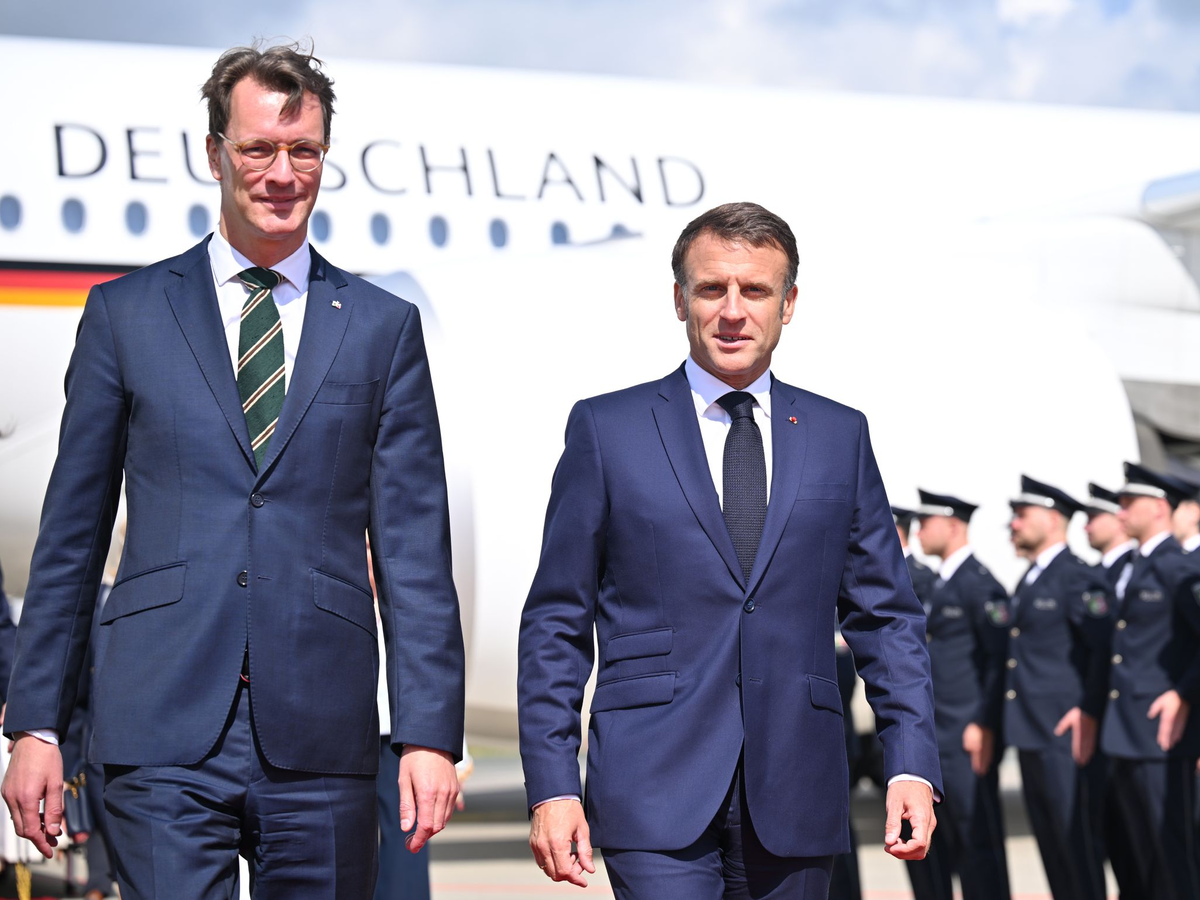 • NRW-Ministerpräsident Hendrik Wüst (l) empfängt Emmanuel Macron. - Foto: David Inderlied/dpa