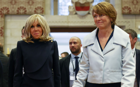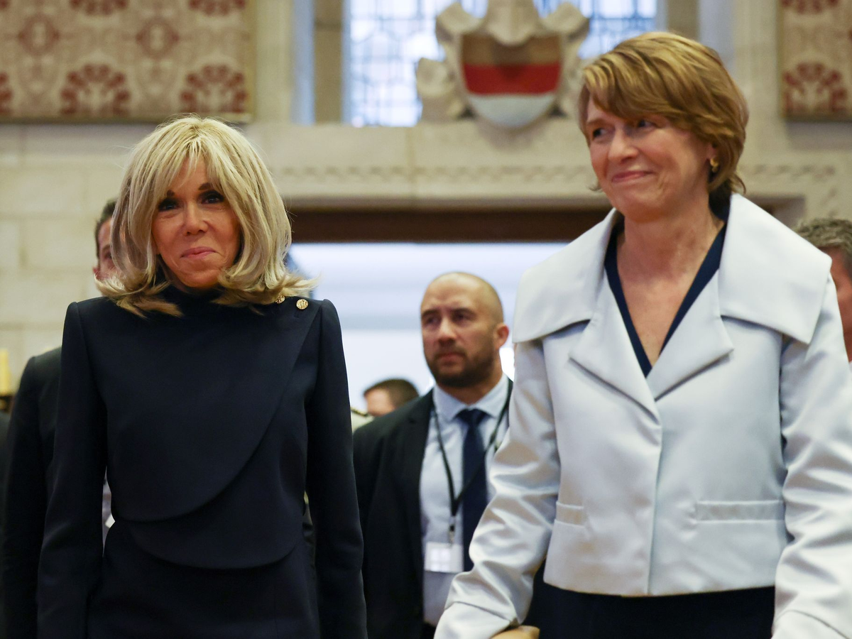 • Brigitte Macron (l) und Elke Büdenbender, die Ehefrau des Bundespräsidenten, betreten den Festsaal im Rathaus Münster. - Foto: Rolf Vennenbernd/dpa-POOL/dpa