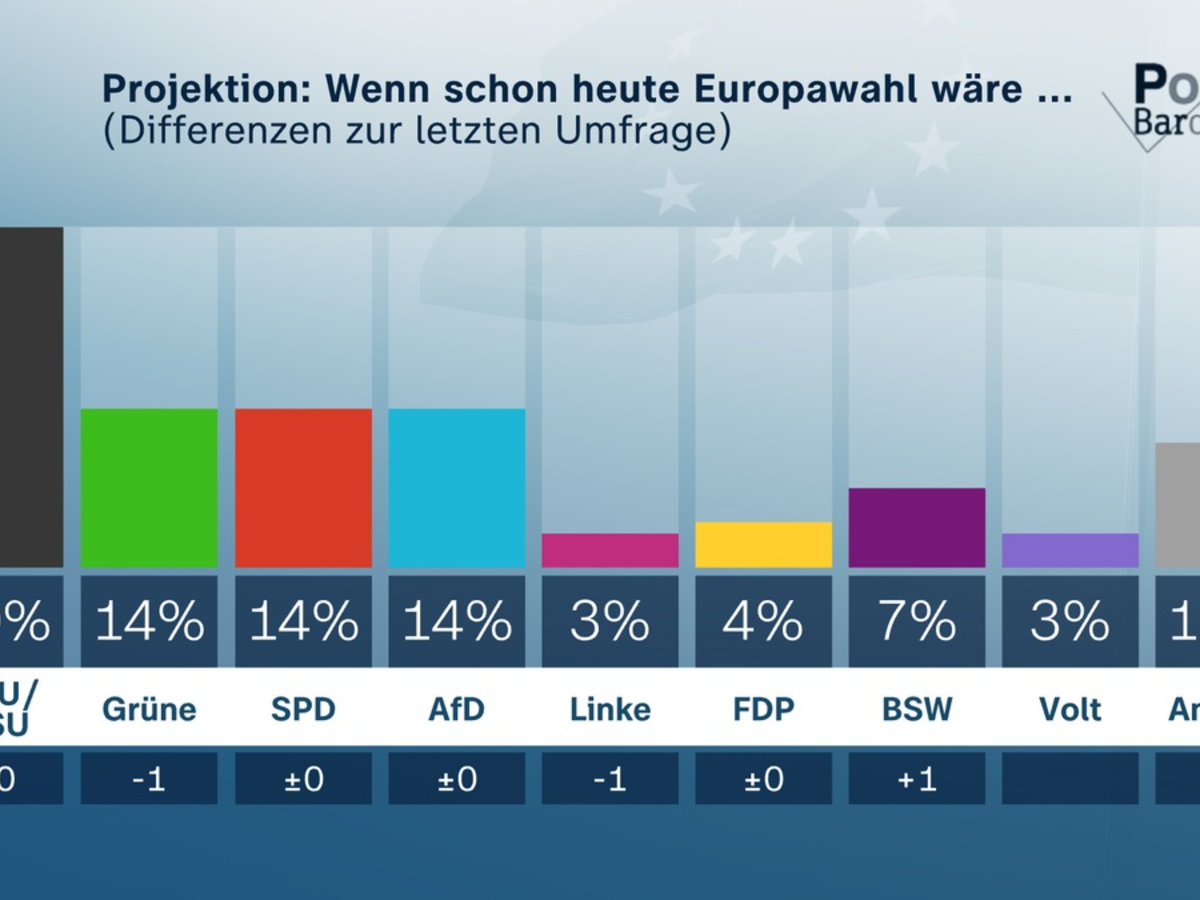 Wenn schon heute Europawahl wäre, dann ergäben sich derzeit folgende Projektionswerte für die Parteien: Die Union käme auf 30 Prozent (unverändert gegenüber der Umfrage vor einer Woche), die Grünen auf 14 Prozent (minus 1), die SPD auf 14 Prozent, die AfD auf 14 Prozent (beide unverändert), die Linke auf 3 Prozent (minus 1), die FDP auf 4 Prozent (unverändert), das BSW auf 7 Prozent (plus 1) und Volt auf 3 Prozent. Die anderen Parteien zusammen lägen bei 11 Prozent, darunter keine Partei, die mindestens drei Prozent erzielen würde.