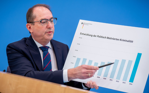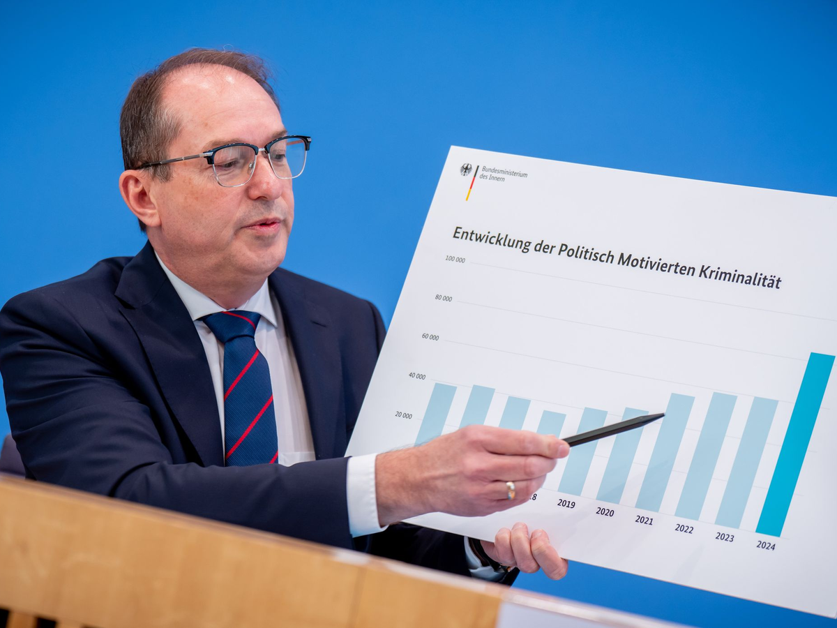 Am stĂ€rksten war der Anstieg 2024 bei den Straftaten, die mutmaßlich rechts motiviert waren. Ihre Zahl stieg im Vergleich zum Vorjahr laut Polizeistatistik von 28.945 Straftaten auf 42.788 Delikte. «Die grĂ¶ĂŸte Gefahr fĂŒr die Demokratie geht vom Rechtsextremismus aus», sagte der Bundesinnenminister auf Nachfrage und wiederholte damit eine EinschĂ€tzung seiner VorgĂ€ngerin Nancy Faeser (SPD).