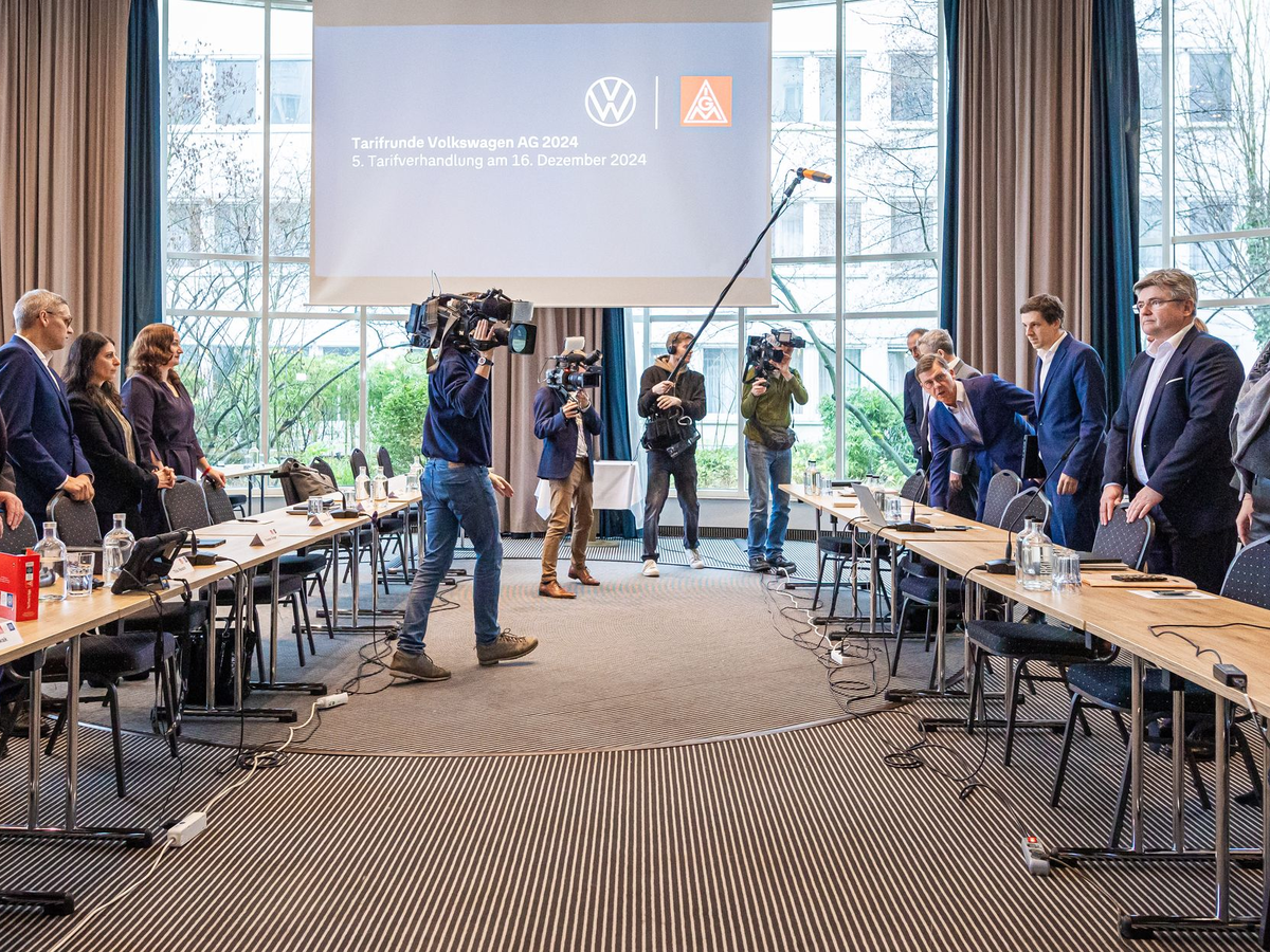 16.12.2024 - 17:08:04 | dpa.deIm Tarifkonflikt bei Volkswagen hat die womöglich entscheidende Verhandlungsrunde begonnen. In Hannover kamen Vertreter des Unternehmens und der IG Metall zu ihrer fünften Beratung zusammen. In einem zweitägigen Verhandlungsmarathon wollen sie versuchen, noch vor Weihnachten zu einer Einigung zu kommen. Mit einem Abschluss wird frühestens am Dienstag gerechnet.