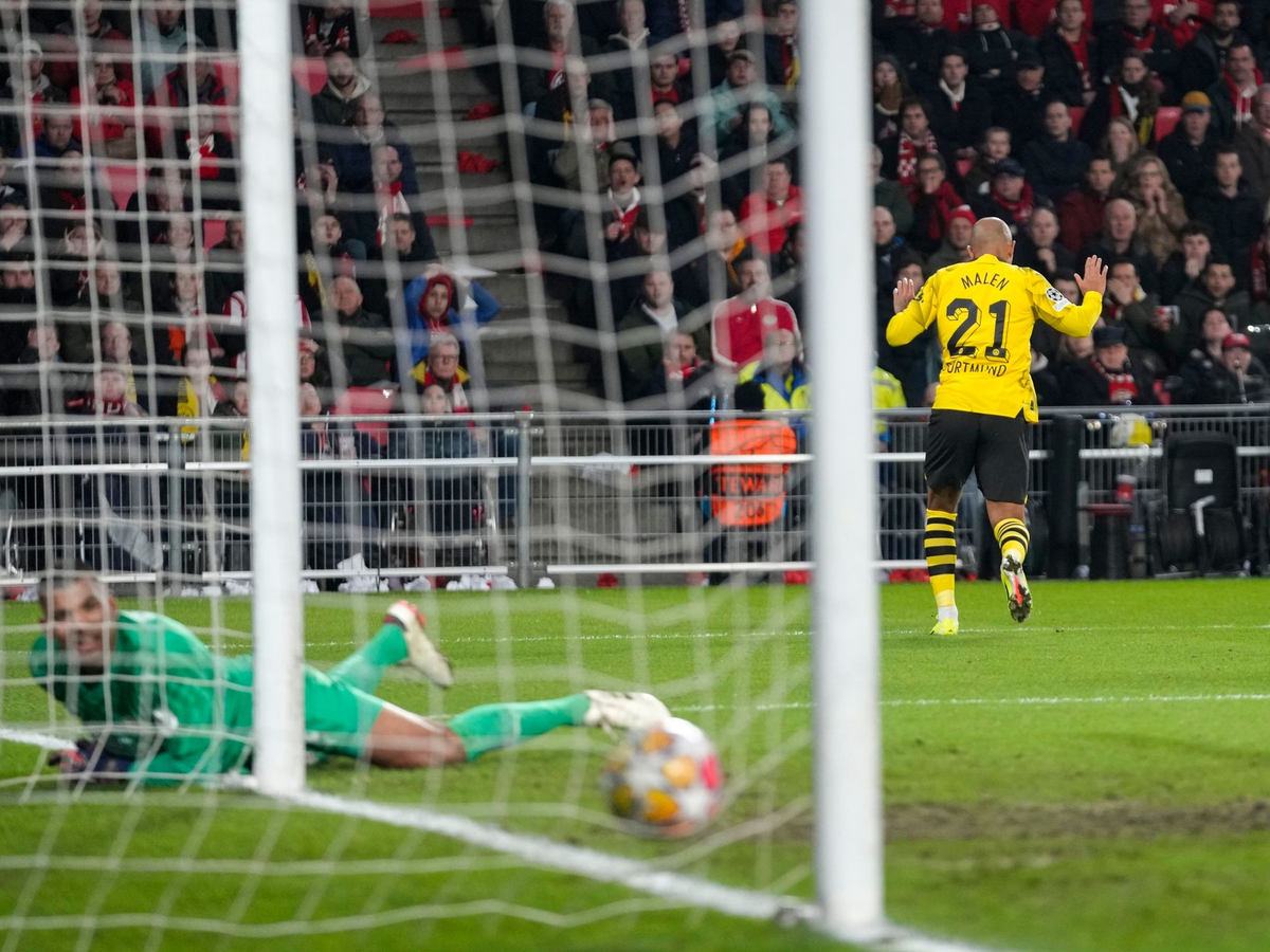 Der BVB setzte sich in der PSV-Hälfte etwas fest und über Marcel Sabitzer landete der Ball bei Malen. Der Niederländer, der im Sommer 2021 von Eindhoven nach Dortmund gewechselt war, setzte sich im Dribbling durch und zog ins kurze Eck ab, der Ball wurde auch noch abgefälscht. Auf allzu ausgelassenen Jubel verzichtete Malen an alter Wirkungsstätte aus Respekt.