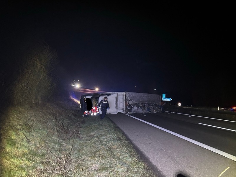 A65/AS LD-Nord - Am heutigen Dienstagmorgen, kurz nach 5:00 Uhr, ereignete sich auf der A65 an der Anschlussstelle Landau-Nord ein schwerer Verkehrsunfall. Ein 74-jähriger Sattelzugfahrer kam kurz nach der sogenannten "Hornbachspange" in Fahrtrichtung Karlsruhe aus bislang ungeklärter Ursache nach rechts von der Fahrbahn ab. Beim Versuch gegenzulenken, verlor der Fahrer die Kontrolle über sein Fahrzeug, woraufhin der Sattelzug umkippte und auf der Fahrbahn zum Liegen kam. Der Fahrer erlitt hierbei Kopfverletzungen und wurde zur stationären Behandlung in ein Krankenhaus gebracht. An dem mit Hausmüll beladenen Sattelzug entstand nach ersten Ermittlungen wirtschaftlicher Totalschaden. Der Gesamtschaden wird derzeit auf über 150.000 Euro beziffert. Zur genauen Klärung der Unfallursache wurde ein Gutachter hinzugezogen. Die A65 ist in Fahrtrichtung Karlsruhe für die Bergungsarbeiten derzeit voll gesperrt. Nach aktuellem Stand wird die Sperrung voraussichtlich bis 20 Uhr andauern. Bereits im morgendlichen Berufsverkehr kam es rund um Landau zu massiven Verkehrsbeeinträchtigungen. Verkehrsteilnehmer, die das Unfallgeschehen beobachtet haben, werden gebeten, sich mit der Polizeiinspektion Edenkoben unter der Telefonnummer 06323 9550 in Verbindung zu setzen.