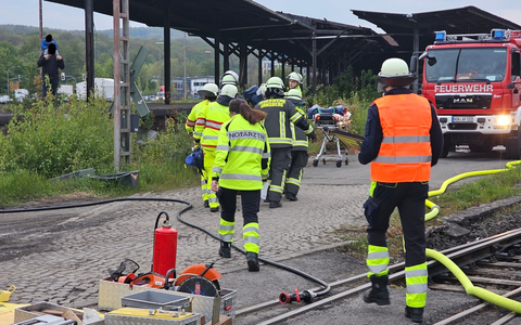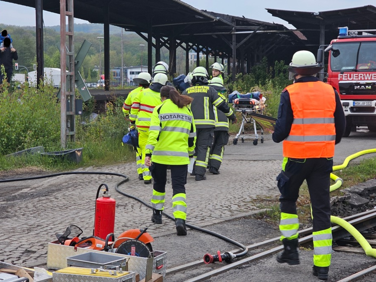 Zusätzlich zum Gebäudebrand kam es auf der Gleisanlage zu einem Zusammenstoß einer Lokomotive und eines PKW. Ein Mitarbeiter der RLG bemerkte das Feuer und die damit verbundene starke Rauchentwicklung im Lokschuppen und verlor hierdurch die Kontrolle über seine im Gebäude stehende Lokomotive, welche dann mit einem PKW, der gerade die Gleise überqueren wollte, kollidierte. Durch den Unfall wurden in dem Fahrzeug zwei Personen eingeklemmt. Mit hydraulischem Rettungsgerät wurde das Fahrzeug geöffnet, um einen Zugang zu den eingeklemmten Personen zu bekommen. Die Befreiung erfolgte stets in enger Absprache mit dem Rettungsdienst.