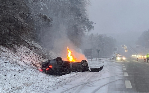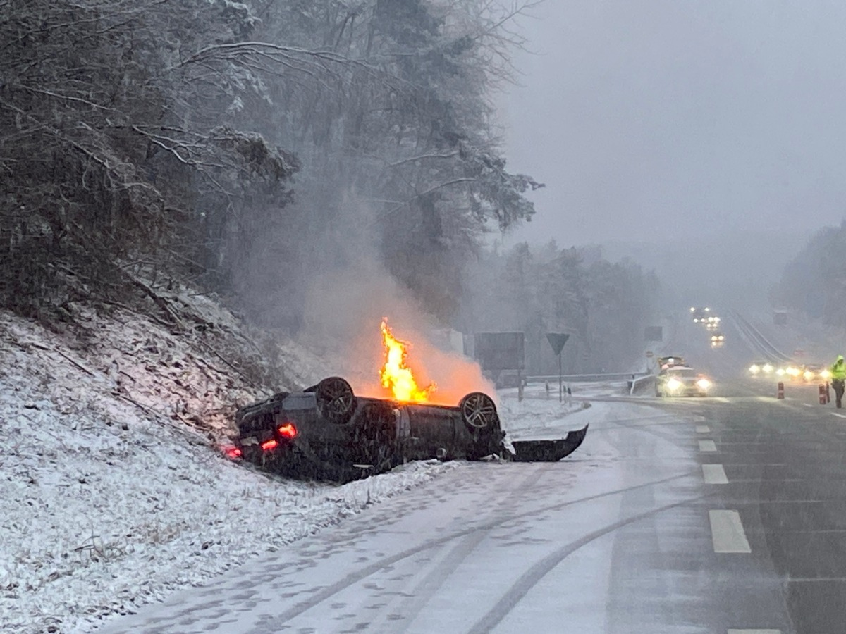 BAB 6; Kaiserslautern - Am gestrigen spĂ€ten Nachmittag, befuhr ein 34-jĂ€hriger US-MiltĂ€rangehöriger die BAB 6 in Richtung Mannheim. Aufgrund nicht angepasster Geschwindigkeit bei starkem Schneeregen verlor der AUDI-Fahrer die Kontrolle ĂŒber sein Fahrzeug und geriet ins Schleudern. Der PkW ĂŒberschlug sich zweimal und kam auf dem Dach liegend zum Stillstand. Der Fahrer konnte sich glĂŒcklicherweise selbststĂ€ndig aus demn mittlerweile brendenden Fahrzeug befreien. Der PKW stand im Anschluss im Vollbrand und wurde durch die Feuerwehr gelöscht. Der Fahrer kam mit leichten Verletzungen in ein Krankenhaus. Der total zerstörte PKW musste mittels Kran geborgen werden. Insgesamt dĂŒrfte ein Schaden von ca. 30.000 Euro entstanden sein. FĂŒr die Dauer der Lösch- und Bergungsarbeiten, waren der rechte und mittlere Fahrstreifen gesperrt. Der Verkehr wurde ĂŒber den linken Fahrstreifen an der Unfallstelle vorbeigefĂŒhrt.