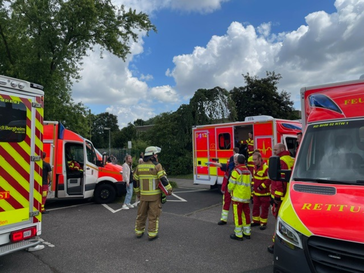 FW Bergheim: Mehrere betroffene Kinder nach vermutlichem Reizgasaustritt in Bergheimer Hauptschule Rettungsdienst behandelt 16 Kinder - Kind und Lehrerin ins Krankenhaus transportiert