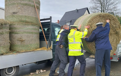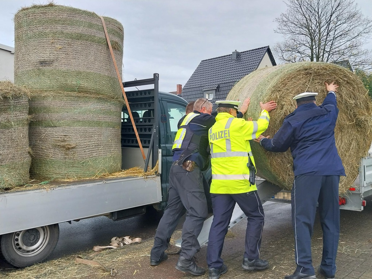 Bei zwei Fahrzeugen war die Ladung nicht ordnungsgemäß gesichert. Die mangelhafte Sicherung von Heuballen auf einem Transporter wurde als Verstoß geahndet und weil der Fahrzeugführer die circa 300 Kilogramm schweren Heuballen nicht alleine umladen konnte, halfen ihm die Beamten kurzerhand tatkräftig, damit er seine Fahrt sicher fortsetzen konnte.