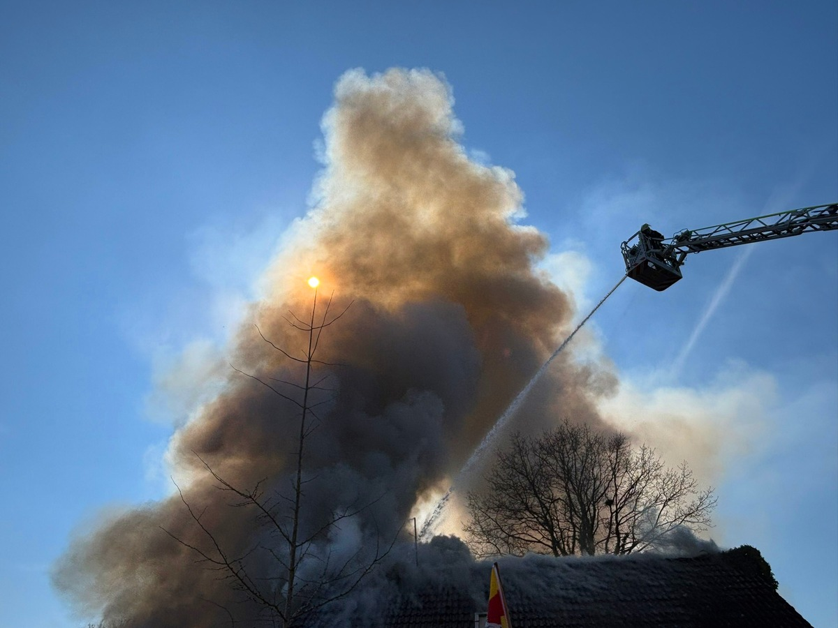 Bermatingen - Am Freitagmittag (20.März 2026), kurz nach 13 Uhr, kam es in der Ringstraße in Bermatingen (Bodenseekreis) zu einem Brand einer Werkstatt in einem Wohngebiet, der in Folge auf das dazugehörende Wohnhaus übergriff. Schon auf der Anfahrt konnten die um 13.17 Uhr alarmierten Einsatzkräfte eine dichte schwarze Rauchwolke sehen und das Alarmstichwort erhöhen, um direkt weitere Kräfte hinzuzuziehen. Beim Eintreffen der Einsatzkräfte der Freiwilligen Feuerwehren Bermatingen und Markdorf stand der angebaute Carport- und Werkstattbereich mit zahlreichen Fahrrädern bereits im Vollbrand. Personen waren zum Zeitpunkt des Brandausbruchs nicht anwesend, so dass die Feuerwehr sofort eine massive Brandbekämpfung mit mehreren Strahlrohren einleitete. Als Schwierigkeit zeigte sich, dass die Wasserversorgung aus dem Hydrantennetz in dem betreffenden Bereich nicht optimal war, weswegen die Schlauchwagen aus Markdorf und Salem, sowie Tanklöschfahrzeuge alarmiert wurde, um hier eine separate Löschwasserversorgung aufzubauen. Zur Einsatzunterstützung war auch der große Einsatzleitwagen aus Friedrichshafen, der Gerätewagen Atemschutz-Strahlenschutz aus Markdorf und Löschfahrzeuge der umliegenden Wehren mit vor Ort. Starke Kräfte des Rettungsdienstes und Helfer der Einsatzgruppen der Bereitschaften (EgB) des DRK aus Markdorf und Immenstaad standen zur Absicherung und Versorgung der der Einsatzkräfte bereit. So wurde gegen später auch Verpflegung für die eingesetzten Helfer bereitgestellt. Leider konnte die Feuerwehr nicht verhindern, dass auch das Dachstuhlgeschoß des Gebäudes, sowie ein auf dem Nachbargrundstück geparkter Wohnanhänger ein Raub der Flammen wurden. Verhindert werden konnte erfolgreich, dass das Feuer auf die Nachbargebäude rechts und links und auf einen sich auf dem Grundstück befindlichen oberirdischen Flüssiggastank übergriff. Weiter wurden einige Gasflaschen aus dem Gefahrenbereich gebracht. Wegen der starken Rauchentwicklung wurde vorsorglich über den Warndienst NINA eine Warnung an die Bevölkerung versandt, mit der Bitte Fenster und Türen geschlossen zu halten. Gegen 15 Uhr war der Brand im Wesentlichen gelöscht. Die Nachlöscharbeiten zogen sich bis in den Abend. Eine Brandwache blieb zur Sicherheit vor Ort. Das Gebäude ist unbewohnbar, stark einsturzgefährdet und kann vorerst nicht betreten werden. Zur Höhe des Sachschadens, wie auch zur Brandursache hat die Feuerwehr keine Kenntnisse. Hierzu hat der Polizeiposten Markdorf die Ermittlungen aufgenommen. Die Polizei geht in einer ersten Schätzung von einem Sachschaden von bis zu 700.000 EUR aus. Die Feuerwehr war zeitweise mit bis zu 113 Einsatzkräften und 19 Fahrzeugen vor Ort im Einsatz. Im Feuerwehrhaus Markdorf befand sich eine Bereitschaft zur Sicherstellung des Grundschutzes in der Region. Die Ringstraße und zuführenden Straßen waren wegen der Einsatzmaßnahmen zweitweise gesperrt.