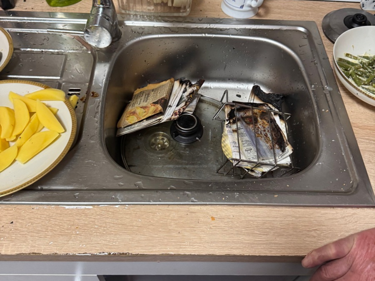 Stattdessen, wie in diesem Fall, das Feuer z.B. mit einer Decke ersticken, oder idealerweise mit einem geeigneten Fettbrandlöscher löschen.