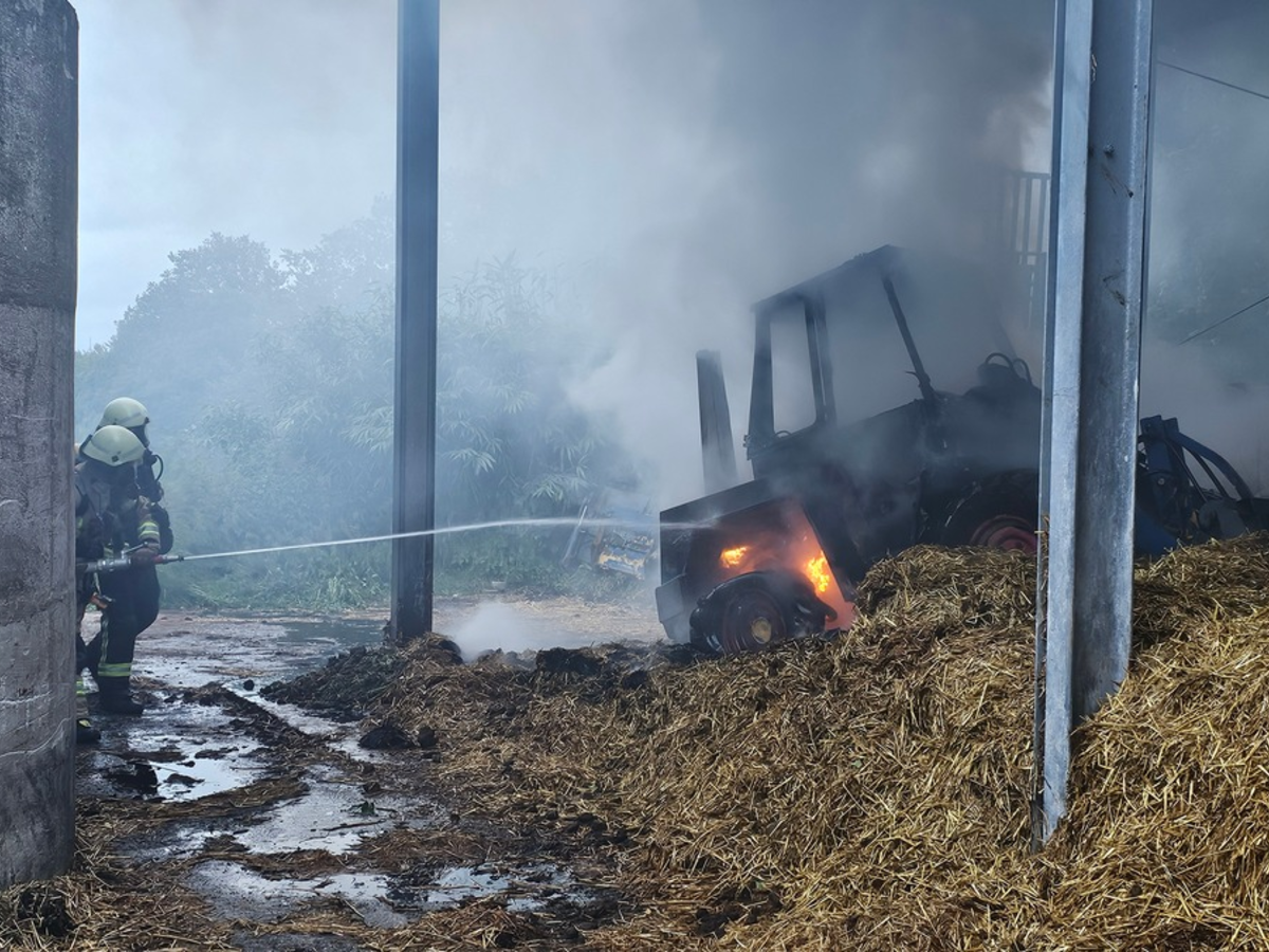 Bei eintreffen der ersten Einsatzkräfte bestätigte sich die Lage. Ein kleiner Traktor brannte in voller Ausdehnung, stehend auf einem Misthaufen. "Die Eigentümer haben vor unserem eintreffen damit begonnen, den Brand eigenständig zu löschen." erklärt Pressesprecher Jens Knipper. "Dadurch konnte wahrscheinlich schlimmeres verhindert werden." so Knipper weiter. Die Feuerwehr übernahm den Schlauch, welcher durch eine Zysterne auf dem Hof gespeist wurde und baute währenddessen auch eine eigene Löschwasserversorgung von den Fahrzeugen auf. Mit zwei C-Rohren wurde der Brand letztlich unter Atemschutz gelöscht und eine Ausbreitung auf den Misthaufen, wie auch auf den angrenzenden Stall verhindert.