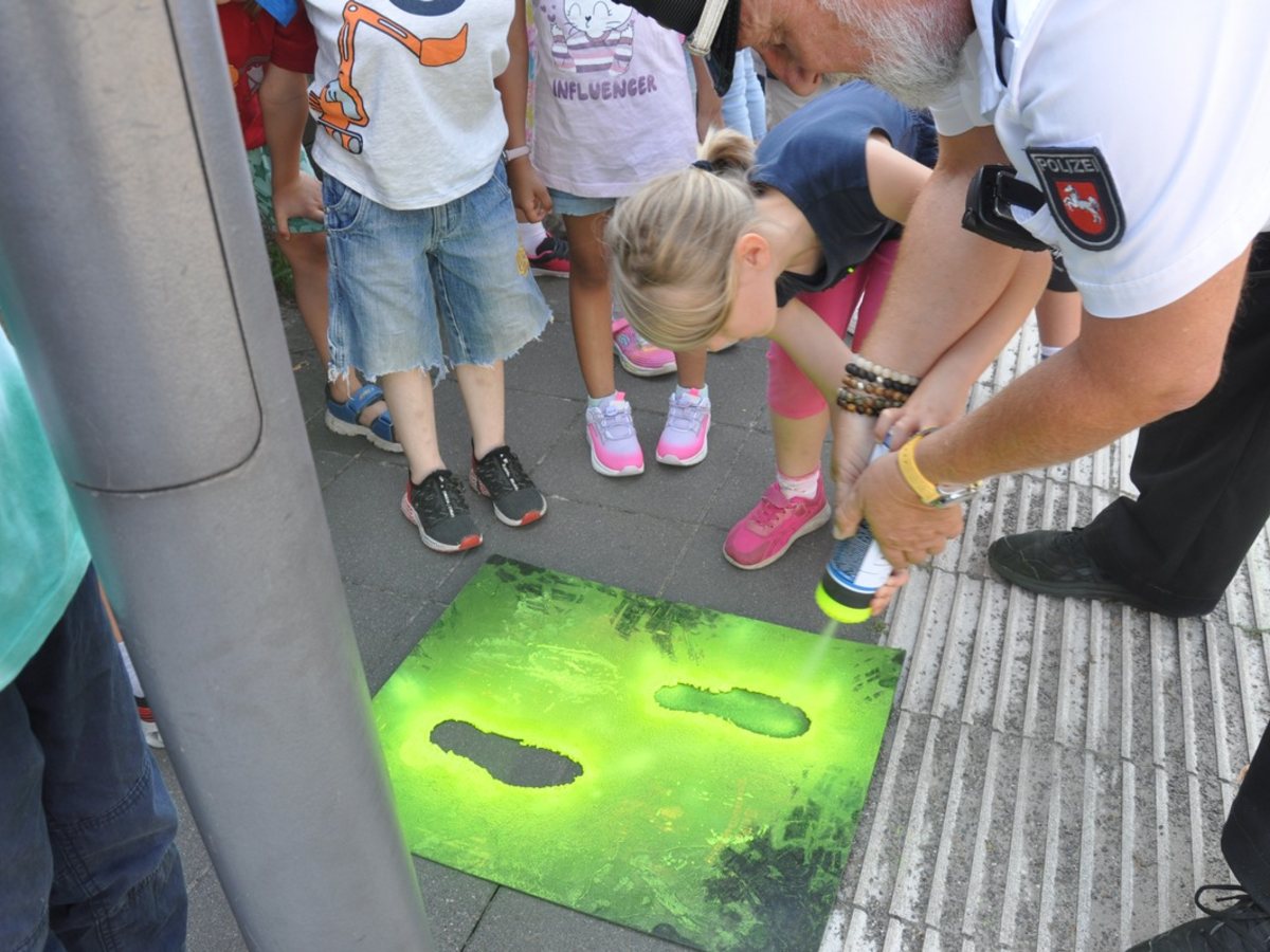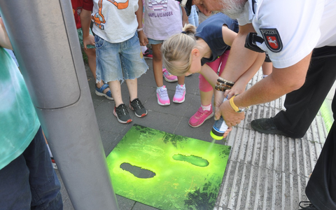 Celle - Am Montag, den 12.08.2024 startete der diesjährige erste Jahrgang der Celler Grundschulen in das Schuljahr. Damit beginnt für die Erstklässlerinnen und Erstklässler eine aufregende Zeit mit kleinen und großen Herausforderungen, die für viele schon mit dem neuen Schulweg beginnt. Eine Menge Mädchen und Jungen werden in den kommenden Tagen und Wochen zum ersten Mal allein im Straßenverkehr unterwegs sein. Um die Kinder bei bzw. auf ihrem Schulweg ein wenig zu unterstützen, gibt es in Niedersachsen bereits seit über 20 Jahren die Aktion "Kleine Füße - sicherer Schulweg". Sie richtet sich in erster Linie an die Kinder und durch die "gelben Füße", die mittels gelber Sprühfarbe und Schablonen an den wichtigsten Gehwegen aufgebracht werden, werden die Kinder sicher zur Schule geführt. Am Dienstag den 13.08.2024 besuchten der Kontaktbereichsbeamte der Polizeiinspektion Celle, Frank Voigt und seine Kollegin, Kontaktbereichsbeamtin Eike Thiel die erste Jahrgangsstufe der Grundschule in Altencelle. Gemeinsam mit den Klassenlehrerinnen brachten sie den frisch eingeschulten Kindern das Thema Straßenverkehr näher und trugen mit ihnen die gelben Füße in der Umgebung der Grundschule Altencelle (Jahnstraße) auf. Bei der Gelegenheit absolvierten die Kinder der beiden ersten Klasse auch gleich ihre erste Prüfung: alle bestanden den Gehwegführerschein. Bei diesem geht es darum, die Gefahren, die es im Straßenverkehr auch für Fußgängerinnen und Fußgänger gibt, zu erkennen und sich entsprechend zu verhalten.