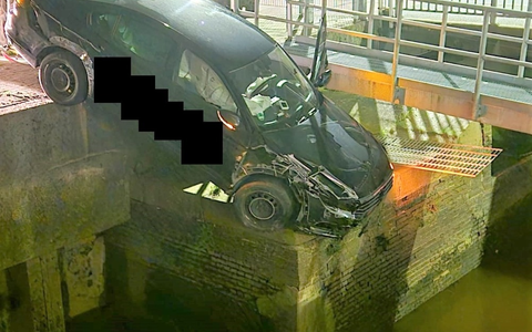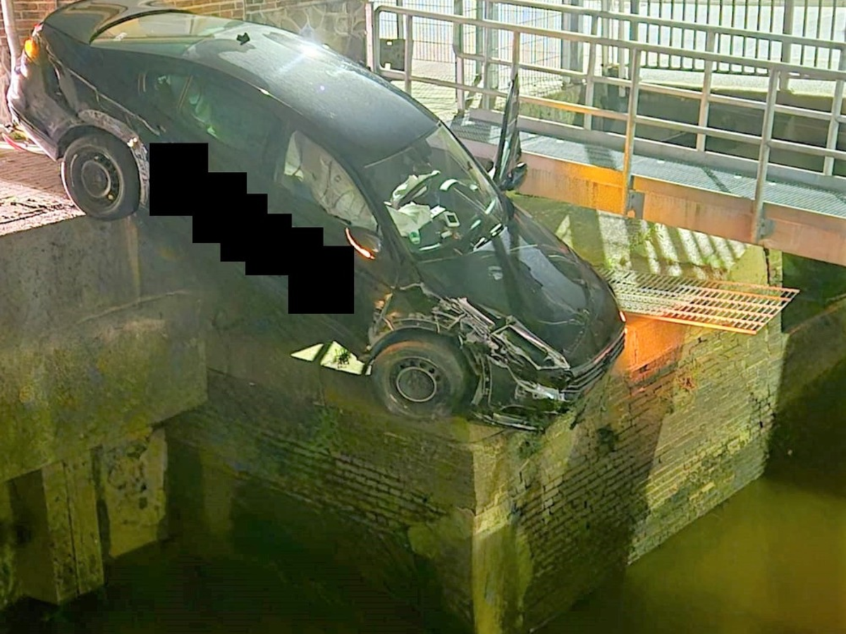 Seine Fahrt endete nur wenige Meter weiter. Er stürzte mit dem PKW über die Kante des dortigen Hafenbeckens und blieb mit viel Glück auf einem tieferliegenden Mauervorsprung stecken.