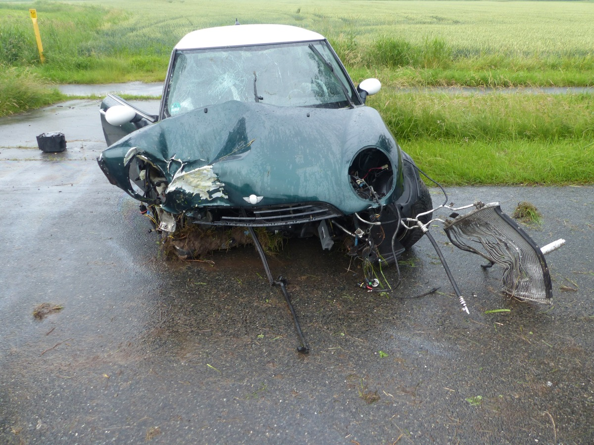 22.06.2024 - 12:46:52 | presseportal.deWurster Nordseeküste. Am Freitagabend (21.06.2024), gegen 18:40 Uhr, kam es zu einem Verkehrsunfall auf der Misselwardener Landstraße zwischen Wremen und Mulsum. Ein 20-Jähriger aus der Wurster Nordseeküste war hier mit seinem Pkw auf regennasser Fahrbahn alleinbeteiligt von der Fahrbahn abgekommen und gegen einen Baum geprallt, woraufhin sich der Pkw mehrfach überschlagen hatte. Der 20-Jährige verletzte sich dabei schwer und musste im Krankenhaus behandelt werden. Der Pkw wurde infolge des Verkehrsunfalls derart stark beschädigt, dass der Vorderbau zum größten Teil abgerissen wurde (wirtschaftlicher Totalschaden, s. Lichtbild). Die betroffene Landesstraße 129 musste zeitweise voll gesperrt werden. Bild im Anhang.