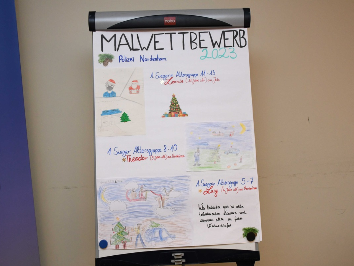 Delmenhorst - In diesem Jahr veranstaltete das Polizeikommissariat Nordenham erstmalig einen Malwettbewerb zum Thema "Die Polizei in der Weihnachtszeit". Teilnehmen konnten alle Kinder im Alter von 5 bis 13 Jahren aus der Stadt Nordenham und den Gemeinden Stadland, Butjadingen und Jade.