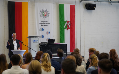 Insgesamt 31 Schülerinnen und Schüler haben im August 2022 den damals neu eingerichteten Bildungsgang "Fachoberschule für Wirtschaft und Verwaltung, Schwerpunkt Polizeivollzugsdienst" (kurz: FOS Polizei) am Konrad-Klepping-Berufskolleg begonnen. Der Dortmunder Polizeipräsident Gregor Lange freute sich, den erfolgreichen Absolventinnen und Absolventen zu ihrem Abschluss gratulieren zu können. Er wünschte ihnen alles Gute für ihr weiteres Studium, am liebsten natürlich bei der Polizei NRW: "Sie sind die Zukunft der Polizei. Wir brauchen Sie. Vor mir sitzen junge Menschen, die sich der Demokratie und der Menschenwürde verpflichtet fühlen und diese in Zukunft schützen werden. Sie alle sorgen für Sicherheit."