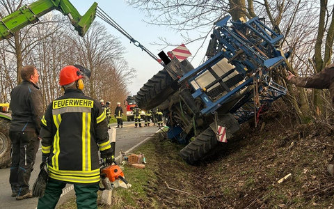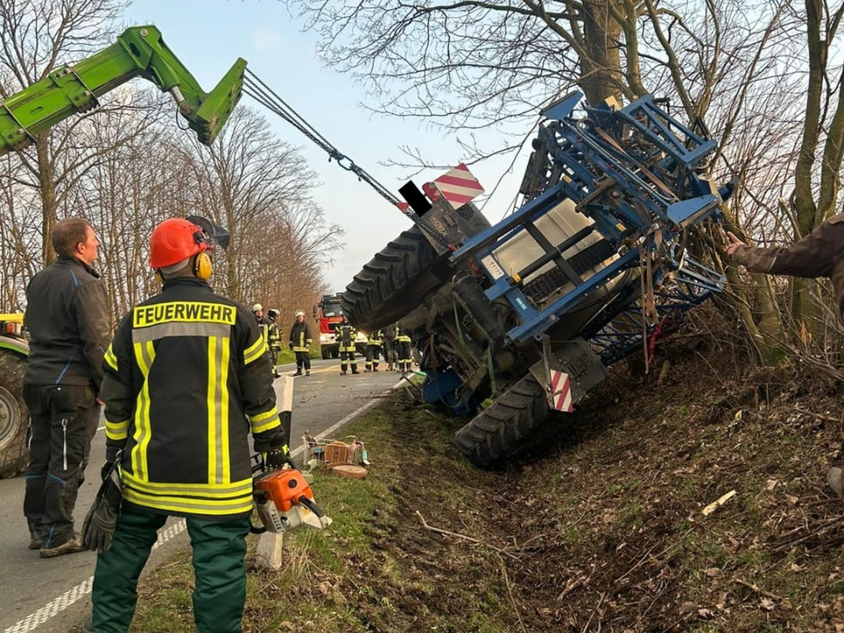 Ense - Zu einem Gefahrstoff- Einsatz wurden eine Gruppe vom Löschzug Bremen und die ABC- Gruppe der Feuerwehr Ense um 16.13 Uhr alarmiert. Auf der B516 war zwischen Ense - Ruhne und Ense - Bremen ein landwirtschaftlicher Schlepper mit Feldspritze in den Straßengraben gekippt. Dabei flossen ca. 700 Liter Düngemittel aus. Das restliche Düngemittel, ca. 300 Liter, wurden in eine andere Spritze umgepumpt, die ein ortsansässiger Landwirt sofort zur Verfügung gestellt hatte. Anschließend wurde die Spritze mittels Tele-Lader und Schlepper wieder aufgerichtet. Da der Straßengraben bei dem Unfall mit Düngemittel verunreinigt wurde, musste dieser mittels Bagger ausgekoffert werden. Neben der Feuerwehr war die Polizei und die Untere Wasserbehörde im Einsatz, der nach ca 3,5 Stunden beendet war. Verletzt wurde niemand. Fotos / Text: Feuerwehr Ense, Presse- und Öffentlichkeitsarbeit