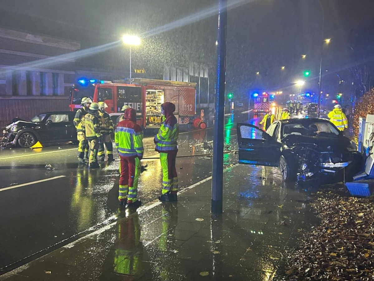Zeitgleich gingen zahlreiche Notrufe bei der Leitstelle der Essener Feuerwehr ein, bei denen die Anrufenden berichteten, dass ein Fahrzeug der Marke BMW mit mehreren anderen Fahrzeugen auf der Westfalenstraße zusammengestoßen war. Sofort wurden Einsatzkräfte verschiedenster Feuer- und Rettungswachen zu der Unfallstelle entsandt. Als die Einsatzfahrzeuge vor Ort eintrafen, fanden sie ein Trümmerfeld vor. Insgesamt waren vier Fahrzeuge an dem Unfall beteiligt, die alle stark beschädigt wurden. Eines der Fahrzeuge war in einem Stromverteilerkasten zum Stehen gekommen, sodass auch dieser kaputt war.
