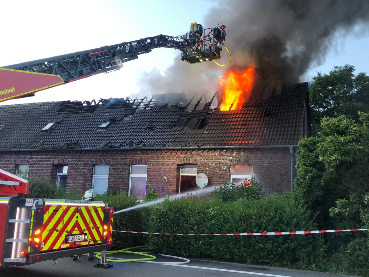 FW Bocholt - Im Bereich der Dinxperloer Straße brannte der Dachstuhl eines Wohnhauses. Zwei Bewohner verletzten sich hierbei leicht wovon einer ins Bocholter Krankenhaus transportiert wurde. Am Freitagabend um 21:00 Uhr erreichten mehrere Notrufe die Einsatzzentrale der Feuerwehr Bocholt und meldeten Flammen und Rauch im Bereich eines Dachstuhles direkt an der Dinxperloer Straße. Umgehend wurde die hauptamtliche Wache und zusätzlich die Freiwillige Feuerwehr Bocholt alarmiert. Bereits auf der Anfahrt der ersten Einsatzkräfte konnte das Szenario bestätigt werden, zusätzlich gab es noch Hinweise auf Personen im betroffenen Gebäude, so dass der Einsatzleiter das Einsatzstichwort auf Feuer Menschenleben in Gefahr erhöhen lies. Vor Ort wurde umgehend die Brandbekämpfung durch zwei Trupps unter Atemschutz mit zwei Strahlrohren sowie über die Drehleiter eingeleitet. Die betroffenen Personen waren bereits im Freien und konnten direkt vom Rettungsdienst versorgt werden. Insgesamt erlitten zwei Personen eine leichte Rauchgasvergiftung. Im weiteren Verlauf mussten die Einsatzkräfte eine Löschwasserversorgung über mehrere hundert Meter verlegen, um die umfangreichen Löschmaßnahmen zu unterstützen. Das Feuer war gegen 00:00 Uhr unter Kontrolle. Im weiteren Verlauf der Nacht wurde Nachlöscharbeiten durch die Feuerwehr durchgeführt. Durch die Löschmaßnahmen konnte das Übergreifen des Feuers auf weitere Teile des Reihenhauskomplex verhindert werden. Insgesamt waren die Feuerwehr und der Rettungsdienst der Stadt Bocholt mit 15 Fahrzeugen und 90 Einsatzkräften im Einsatz.
