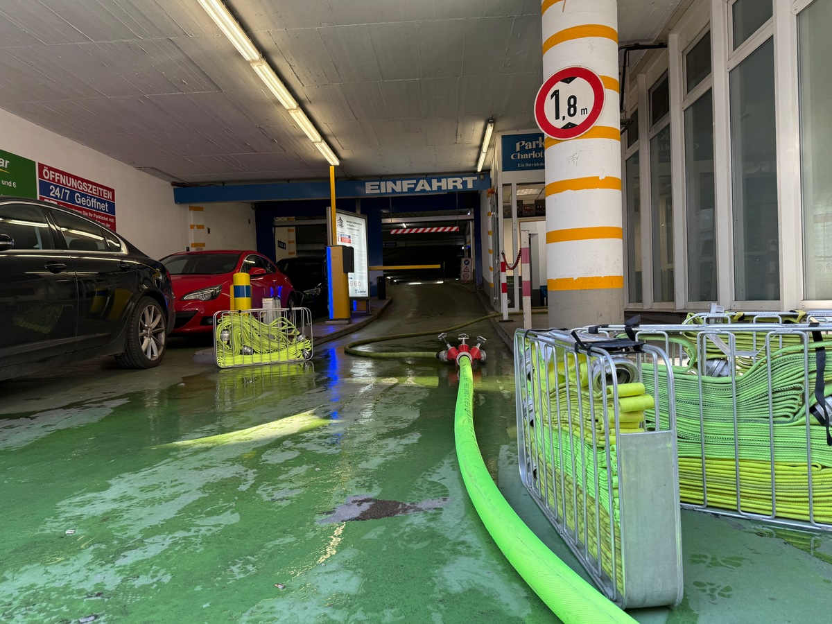Um halb Eins alarmierte es zu einer Rauchentwicklung in einem Düsseldorfer Parkhaus. Ein Mann aus Bremen mit seiner Familie befuhr mit seinem benzinbetriebenen Auto ein Parkhaus auf der Charlottenstr., als seine Frau Flammen und Rauch unter dem Auto bemerkte. Sofort stiegen alle Familienmitglieder aus dem Fahrzeug aus und warnten geistesgegenwärtig alle anwesenden Personen in dem Parkhaus und in der dort ansässigen Fahrzeugreinigungsfirma. Als die Feuerwehr eintraf, war das Parkhaus bereits menschenleer, auch dank der schnellen Reaktion der Autobesitzer.
