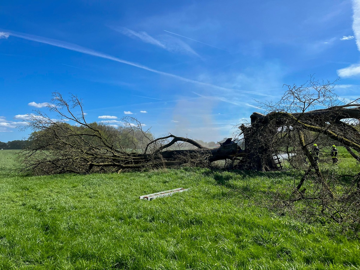 Ersten Erkenntnissen zufolge waren ein Hochsitz sowie eine mÀchtige Eiche in Brand geraten. Da der Baum bereits im Stamm und im Astwerk brannte, musste er unter Zuhilfenahme eines landwirtschaftlichen Fahrzeugs und einer MotorkettensÀge so weit abgetragen werden, dass die EinsatzkrÀfte den Brandherd von innen heraus löschen konnten. Um alle Glutnester zu erreichen, kam unter anderem Netzmittel zum Einsatz. Die Löscharbeiten dauerten knapp zweieinhalb Stunden.