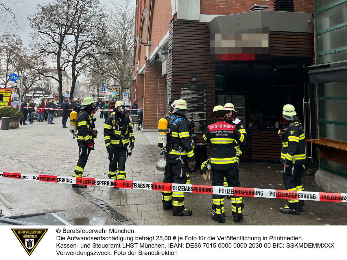 Mehrere Anrufer meldeten eine starke Rauchentwicklung im Bereich eines Kaufhauses am Rotkreuzplatz. In einem Imbissladen war es zu einem Brand gekommen. Die automatische Sprinkleranlage verhinderte eine Brandausbreitung. Einsatzkräfte der Berufsfeuerwehr München löschten die letzten Flammen mit einem Hohlstrahlrohr und kontrollierten das Lokal mit einer Wärmebildkamera. Anschließend wurden die betroffenen Verkaufsräume mit einem Hochleistungslüfter entraucht. Das Kaufhaus wurde zur Sicherheit geräumt. Aufgrund der Löscharbeiten wurde der Rotkreuzplatz für den Verkehr gesperrt. Dadurch kam es zu Behinderungen im Nahverkehr.
