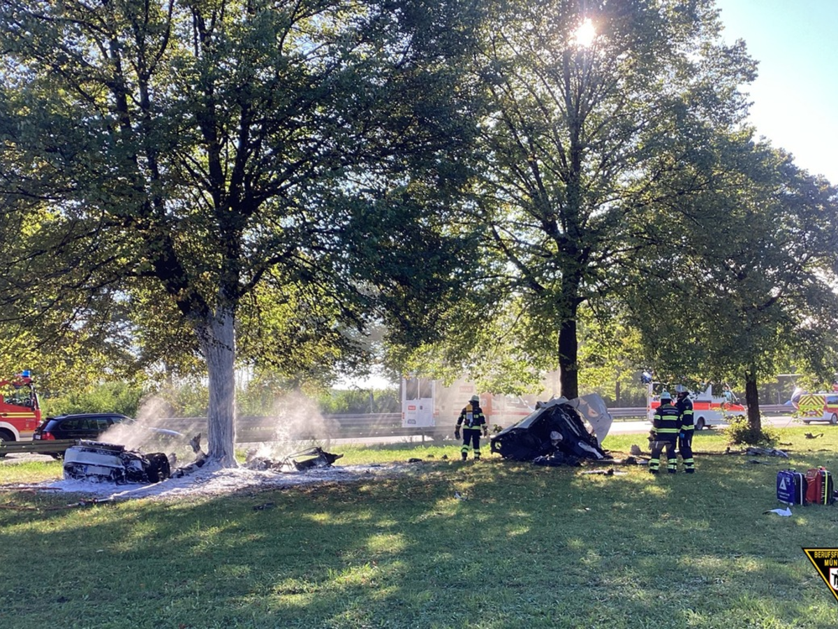 Gegen 16 Uhr war ein Lamborghini auf der A 94 Richtung München unterwegs. Auf Höhe der Ausfahrt Daglfing verlor der 35-jährige Fahrer die Kontrolle über sein Fahrzeug und prallte gegen einen Baum. Dabei wurde der Wagen in zwei Teile gerissen und geriet in Brand. Die Unfallstelle war mit Trümmern übersät. Ersthelfer kümmerten sich um den schwerverletzten Fahrer.