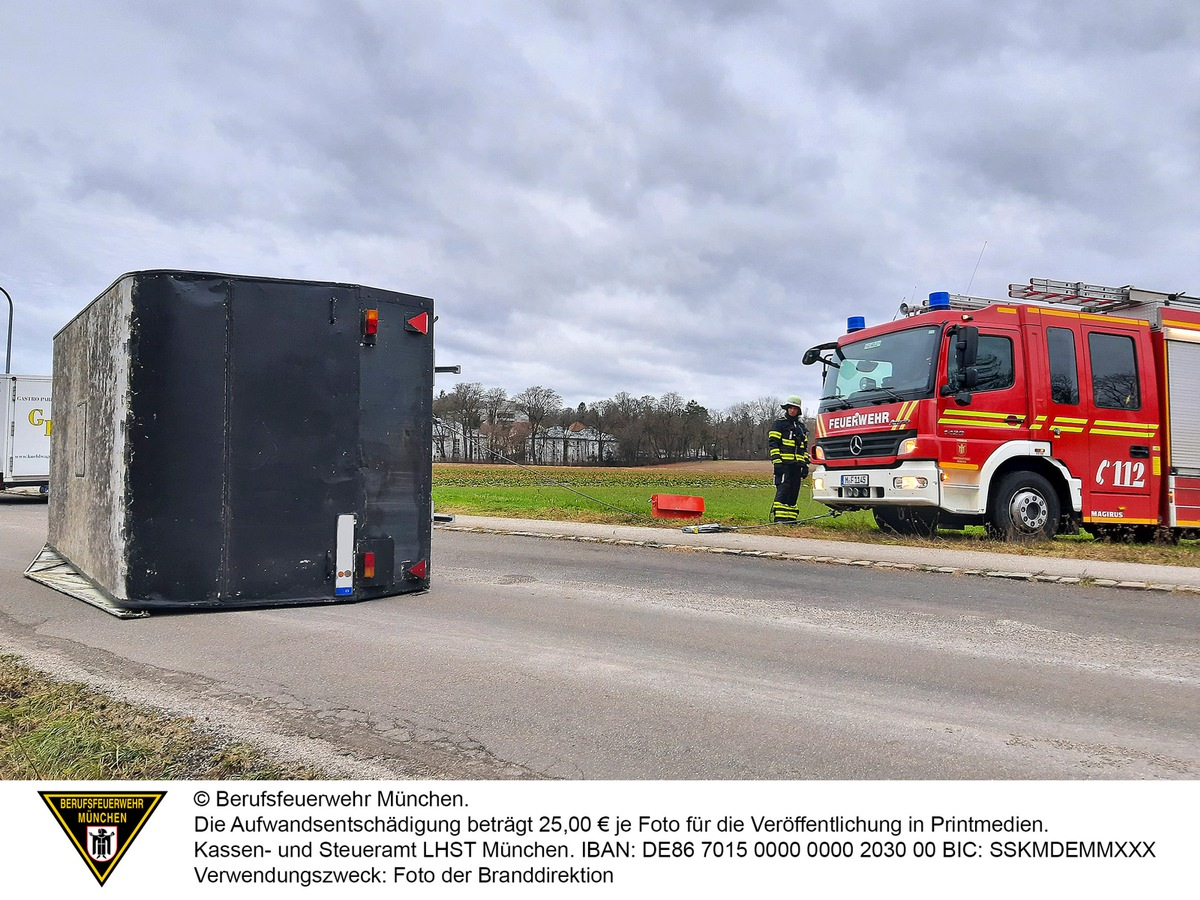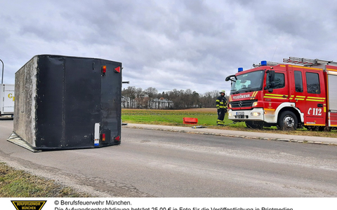 Ab Donnerstagmittag setzten die Windböen in München ein und sorgten für die ersten Einsätze der Feuerwehr München. Dabei handelte es sich bei der Mehrzahl der Einsätze um die üblichen Meldebilder: umgefallene Bauzäune, lose Blechteile und heruntergefallene Äste. Aus der Masse der Einsätze stach ein umgefallener Anhänger in der Ludwigshöher Straße heraus. Offensichtlich hatte hier eine Böe ausgereicht, um auf der freien Straße das Gefährt aus der Spur zu schmeißen und ihn auf die Seite zu legen. Einsatzkräfte der Feuerwehr München stellten den Anhänger mit einem Mehrzweckzug wieder auf seine Räder. Inwieweit an dem Anhänger ein Schaden entstanden ist, konnten die Einsatzkräfte der Feuerwehr nicht abklären.