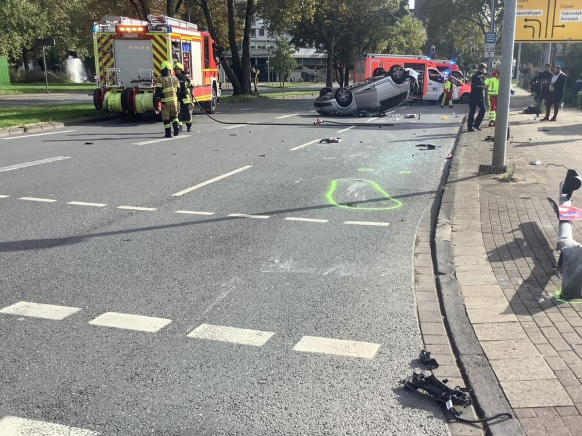 Gelsenkirchen - Verkehrsunfall in Gelsenkirchen Schalke mit mehreren verletzten Personen Im Kreuzungsbereich Overwegstraße-Rolandstraße kam es heute gegen 13:50 Uhr zu einem Verkehrsunfall, an dem zwei PKW beteiligt waren. Durch die Wucht des Aufpralls überschlug sich eins der beiden Fahrzeuge und blieb auf dem Dach liegen. Beim Eintreffen der Rettungskräfte waren alle Insassen aus den Fahrzeugen. Insgesamt waren fünf Personen am Unfallgeschehen beteiligt. Sie wurden durch eine Notärztin und Notfallsanitäter des Rettungsdienstes an der Einsatzstelle rettungsdienstlich versorgt. Drei der beilegten Insassen wurden im Anschluß an die Erstversorgung durch den Rettungsdienst zur weiteren Behandlung in Gelsenkirchener Krankenhäuser transportiert. Um 15 Uhr war der Einsatz abgearbeitet und die Einzustellen wurde an die Polizei übergeben. Die Feuerwehr und der Rettungsdienst Gelsenkirchen waren mit zehn Einsatzkräften an der Einsatzstelle.